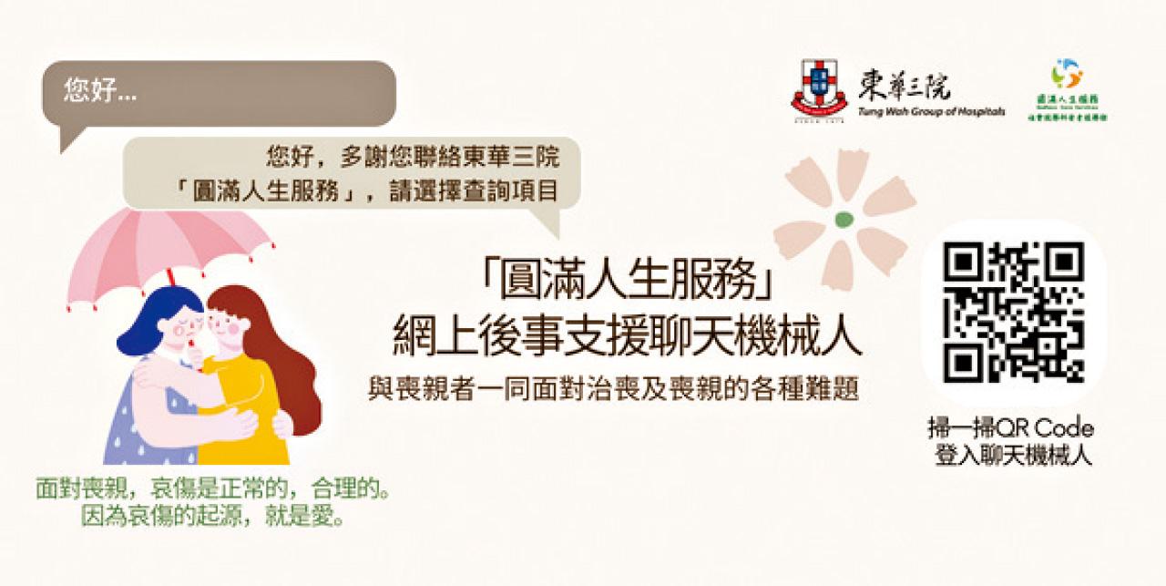 「圓滿人生服務」增設並提升由服務團隊,親自編寫的網上後事支援聊天機械人(chatbot),讓有需要的喪親者和市民可以分別透過「圓滿人生服務」官方網站、Facebook專頁及WhatsApp線上平台等,查詢及獲取準確、全面且實用的後事資訊。服務團隊亦會按需要與查詢者即時對話,處理喪親者對治喪的疑問及喪親後的情緒反應。