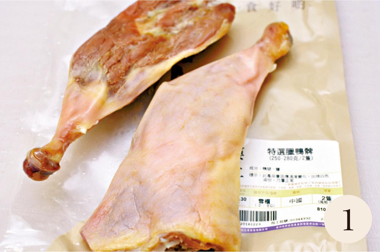 1-2.臘鴨腿和臘腸分別汆水,取出攤涼,切件備用。