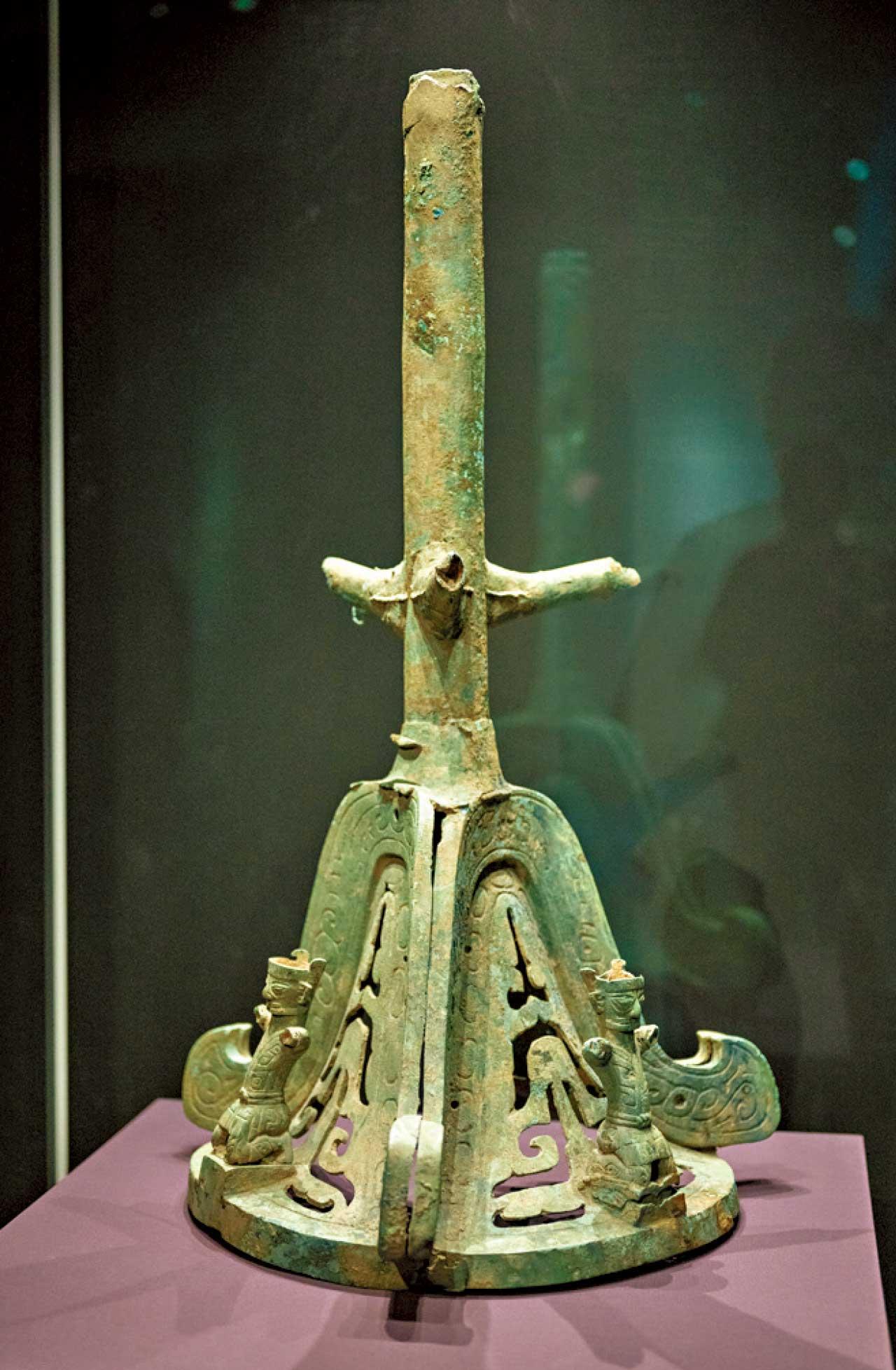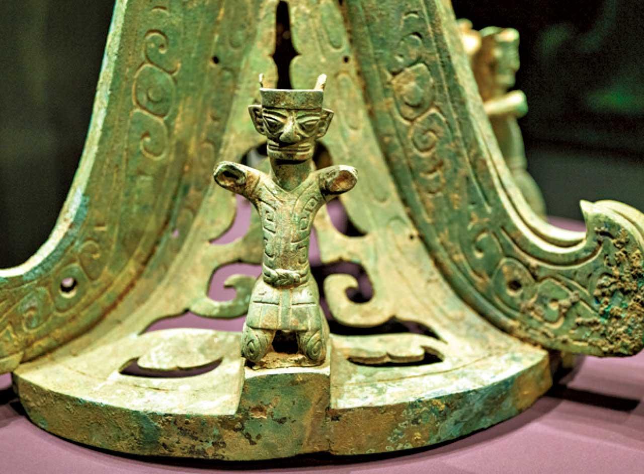 來到最後一期,壓軸出場的「二號神樹底座」是不可錯過的展品。目前三星堆已發現最少六棵神樹,它們既在三星堆社會和祭祀儀式中有重要地位,亦展現了古蜀人奇特的想像力。此器物為神樹的底座和部分焊連的樹幹。底座呈山形,或象徵神樹立在神山。座圈的方台上有跪坐人像,其中一個保存相對完好的小人像,其雙臂環繞胸前,兩手中空,意味本來手握禮器。