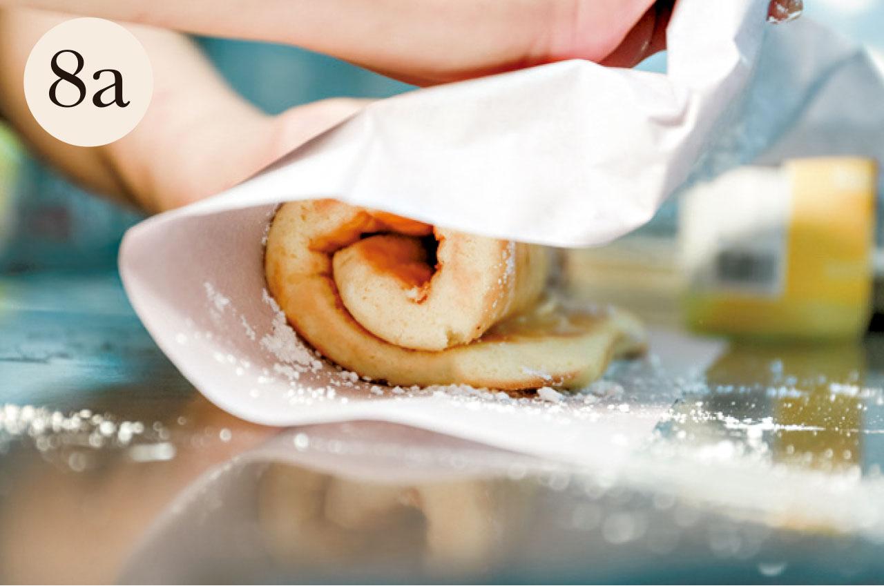6.預備多一張牛油紙,灑上少許糖霜,將蛋糕反覆於其上沾抹。