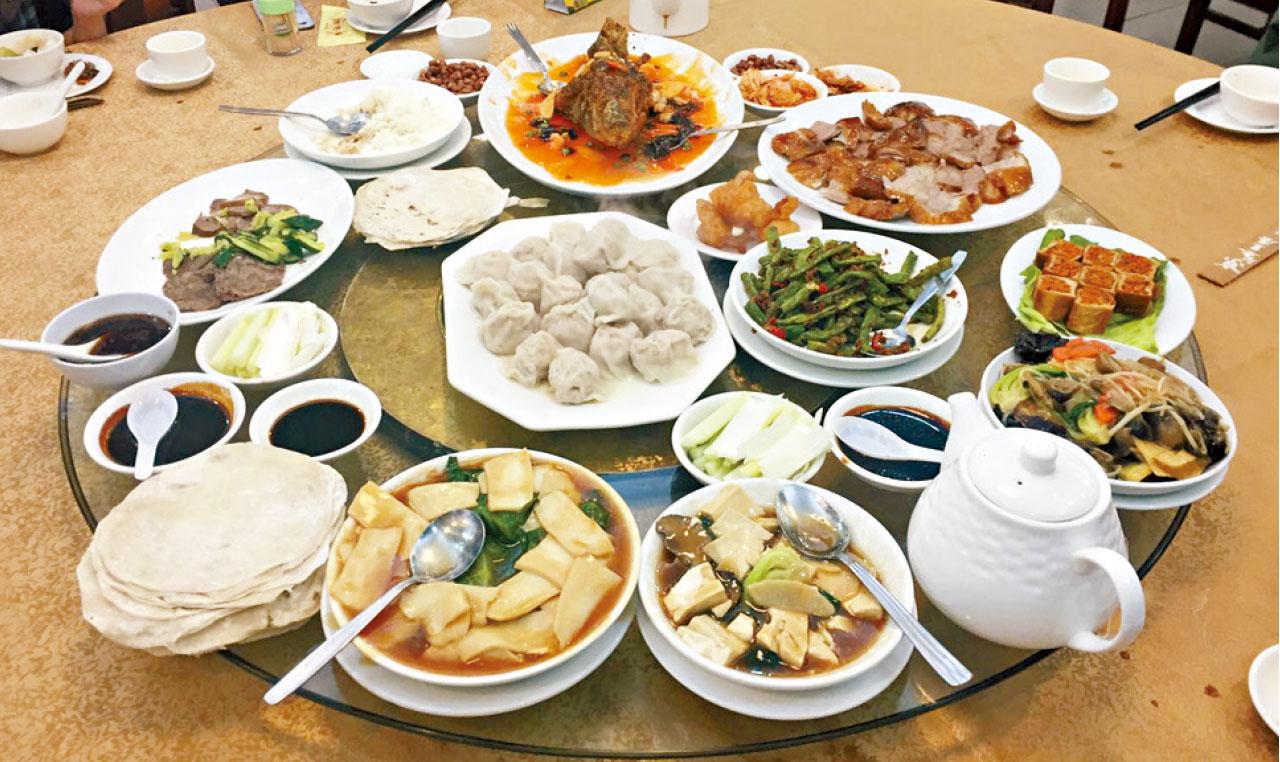 中同一行八人叫了八位用的套餐,三色大拼盤、賽螃蟹、干煸四季豆、鐵板宮保明蝦、北京填鴨、醋溜桂花魚、紅燒仿鮑片、鴨架子湯、菜肉水餃,還有最後的京式甜品,盛惠$1,688,AA制位位只需二百多元,埋單時沒有打架,和氣收場。