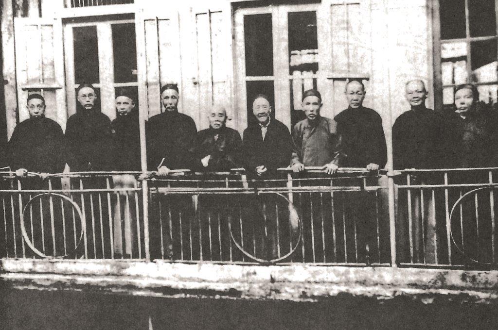 於學海書樓任教的前清翰林,攝於1936年般含道樓址。左起:溫肅、岑光樾、陳念典、區大原、賴際熙、周廷幹、朱汝珍、左霈和陳煜庠。(圖片來源:學海書樓)