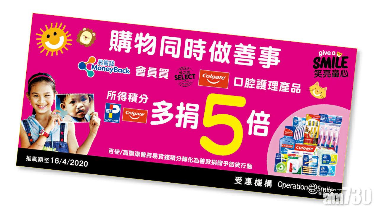 由3月20日起至4月16日,易賞錢會員於全港近280間百佳分店購買百佳自家品牌佳之選或高露潔口腔護理產品,所得的每一積分,會由百佳或高露潔轉化成5倍的善款,捐贈予微笑行動。而百佳亦會於期間在全線分店放置籌款箱,直接收集捐款。