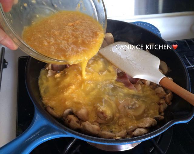 4) 待雞肉及其他材料熟透,倒入芝士蛋漿,平均放入番茄粒及番荽葉;