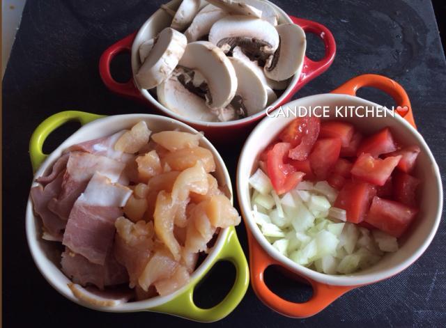 1) 把雞髀肉洗淨瀝乾水切粒、白蘑菇及煙肉切片、番茄洋蔥切粒、巴馬臣芝士及車打芝士刨絲待用;