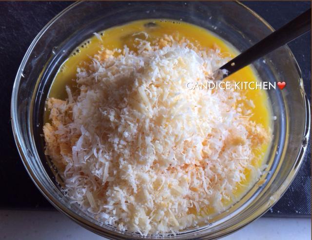 3) 打勻四隻雞蛋,倒入已刨好的芝士絲,用小匙拌勻;