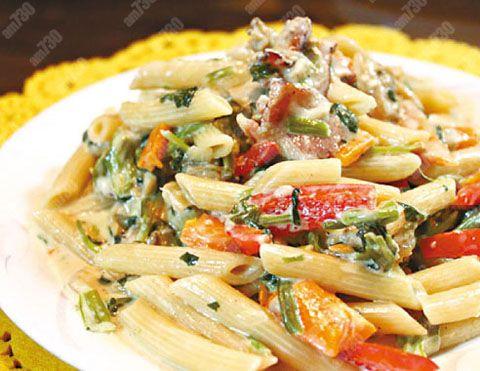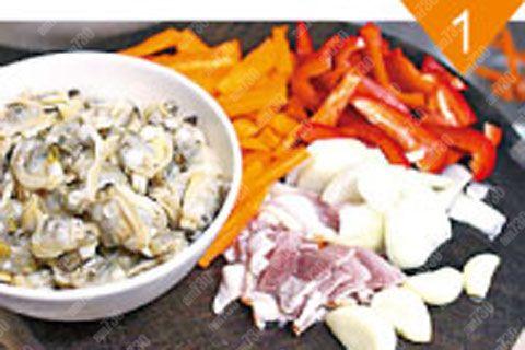材料:直尖粉150克、蜆肉80克、煙肉(切片)3片、甘筍(切絲)半條、紅燈籠椒(切絲)1個、