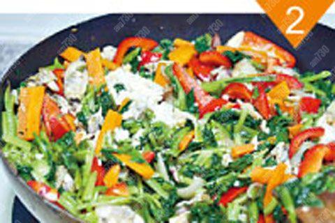 2.加入蜆肉、紅燈籠椒和菠菜略炒;