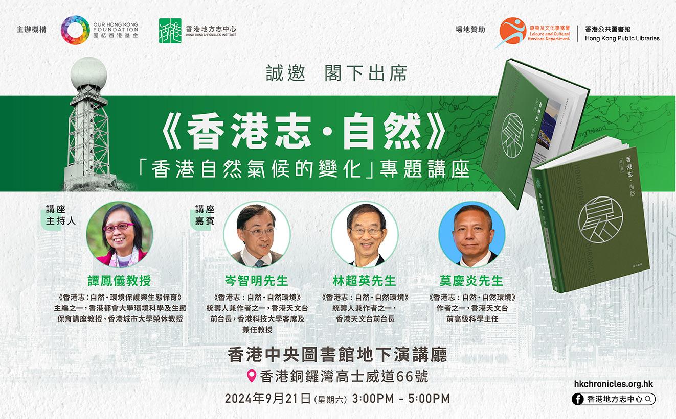 講座更邀請星級嘉賓:《香港志:自然・自然環境》的三位作者主講,包括岑智明先生(前天文台台長)、林超英先生(前天文台台長)及莫慶炎先生(前天文台高級科學主任)。此外,《香港志:自然・環境保護與生態保育》的主編之一,譚鳳儀教授,將擔任講座的主持人。