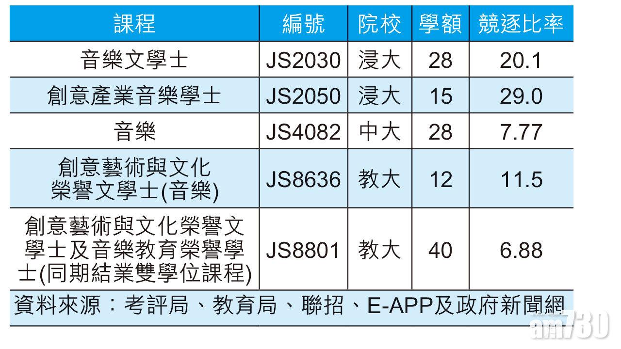 除了JUPAS課程(表)外,有意修讀音樂學科的學生亦可考慮報讀本港的音樂學校,例如香港演藝學院(學位課程)、伯樂音樂學院(證書課程)、香港音樂專科學校(證書/文憑課程)等,又或者考慮海外升學。