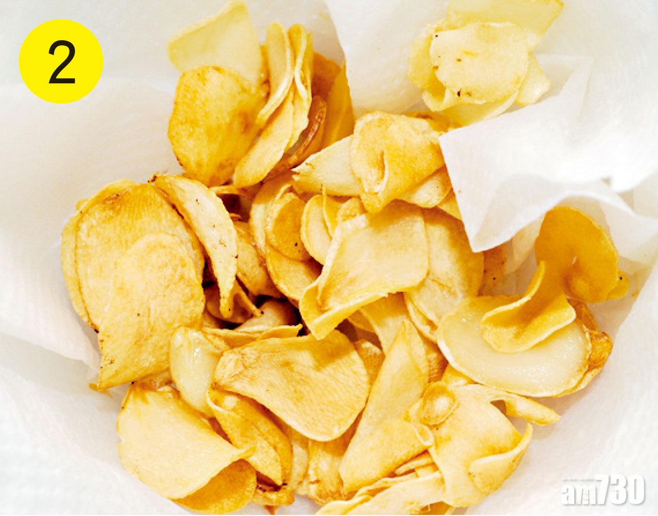 1-2. 蒜頭去衣,切片,用橄欖油炸脆,以廚紙吸走油分。