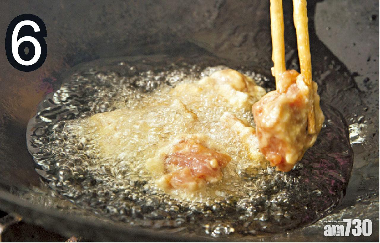 7-9. 油倒起,加入蒜茸炒片刻,加入欖角碎炒片刻,加入汁料推至微微稠身,將排骨加入兜勻至芡汁收乾。