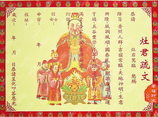 在中國人家中廚房,一定有一塊雕刻著「定福灶君」四字的木雕牌匾。習俗上,農曆12月23日便開始謝灶,廣州一帶流行著不同人有不同日期謝灶的規矩,家家不同,有一說是「官三民四蜑家五」,亦有一說是「官三民四客家五麻瘋六」的謝灶日期,簡而言之,官府謝灶定必早於平民,體現傳統官尊民卑的帝制根源。
