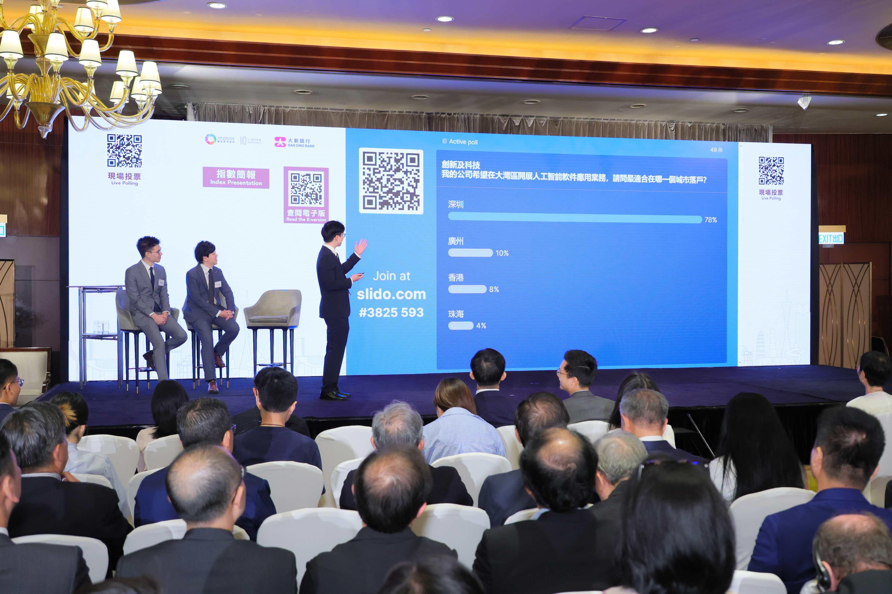 這個發布會很有心思,在開始前先要現場觀眾互動投票,其中一條題目就問,「如果希望在大灣區開展人工智能軟件應用業務,最適合在哪個城市落戶?」選項有廣州、深圳、香港及珠海,大家會點揀呢?