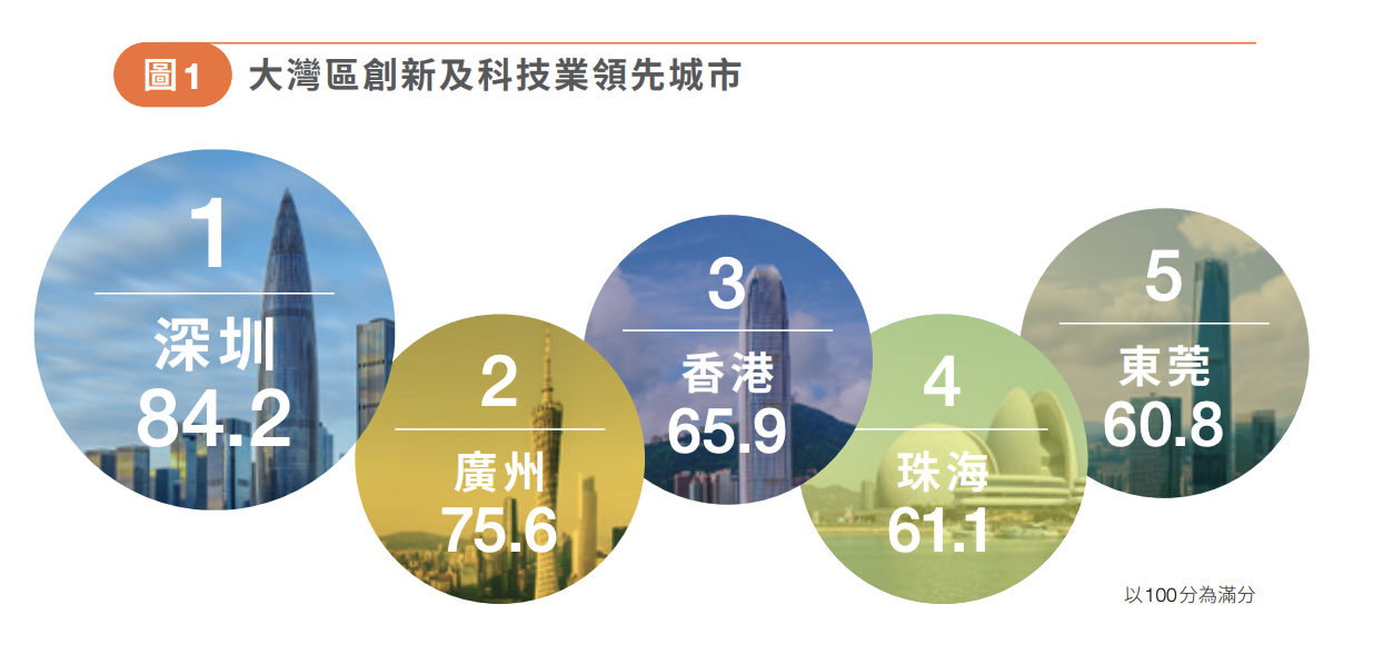 在科技創新方面的大灣區領先城市,香港以66.1分排名第三,遜於深圳及廣州。(團結香港基金–大新銀行大灣區行業發展指數2024》報告)