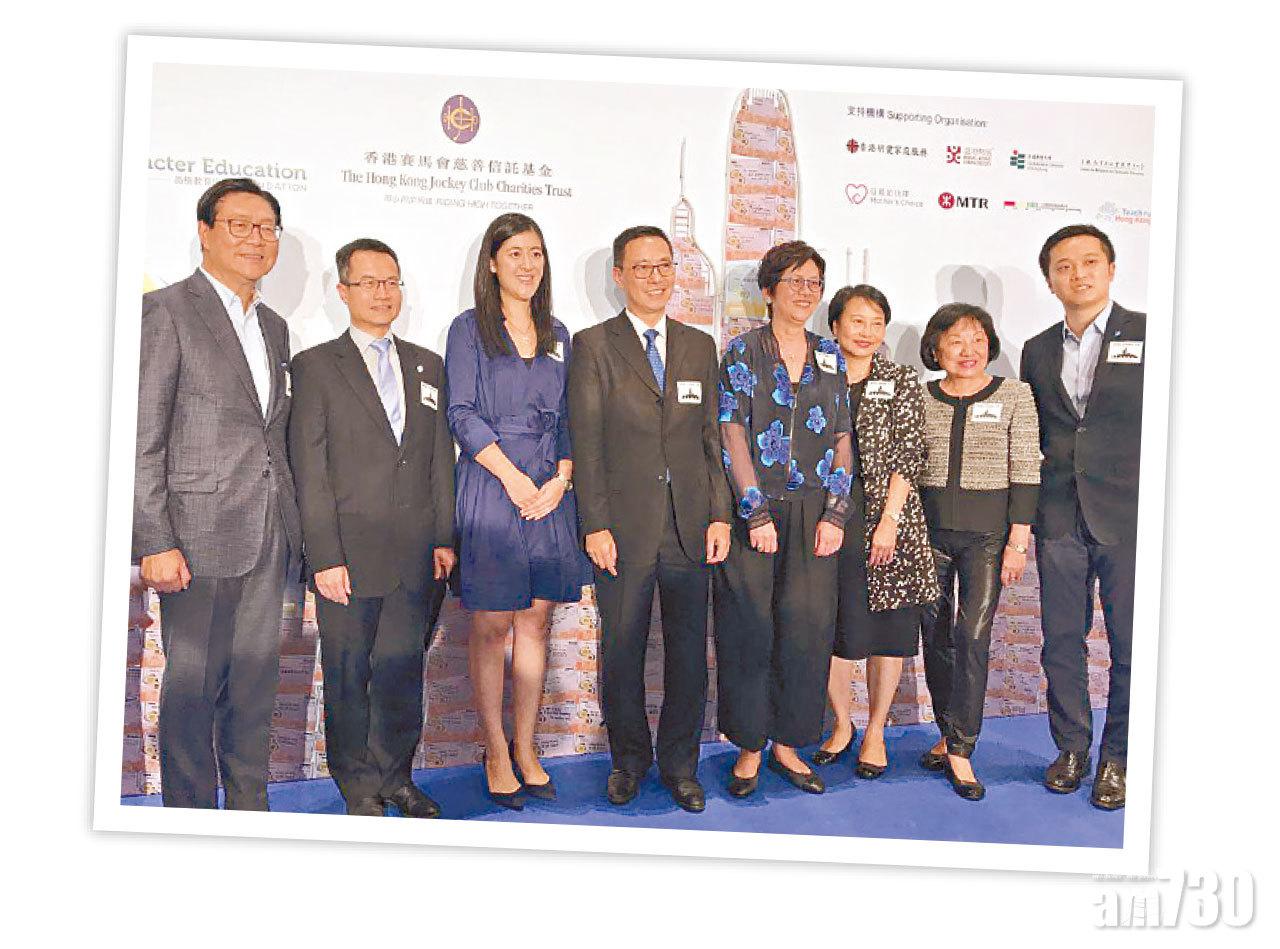品格教育協會創辦人及主席劉馬露明話,今年係第3年搞香港品格日,過去兩年有23萬人參加過品格教育協會的活動,今年更首次獲馬會慈善及信託基金贊助兩年推廣及教育活動。昨日開幕禮亦好多名人到場,圖為(左起)馬時亨、香港賽馬會慈善及社區事務執行總監張亮、品格教育協會創辦人及主席劉馬露明、教育局長楊潤雄、馬太王培琪、民政事務局常秘謝凌潔貞、品格日大使李麗娟及品格教育會董事劉仲恒。