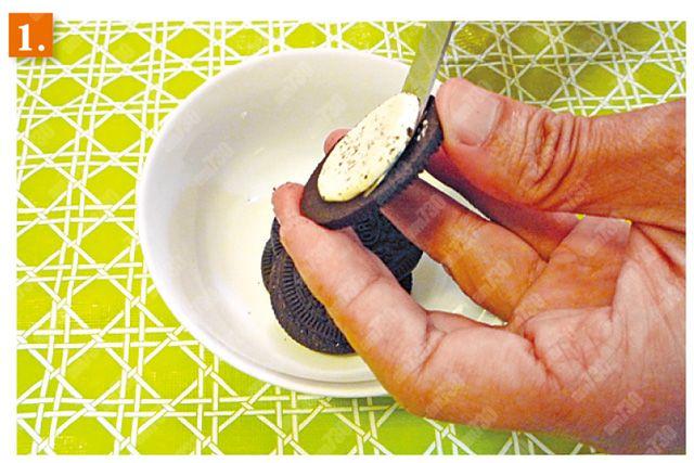1.忌廉芝士放在室溫放軟,牛油隔熱水溶化和將朱古力夾心餅的夾心去掉。