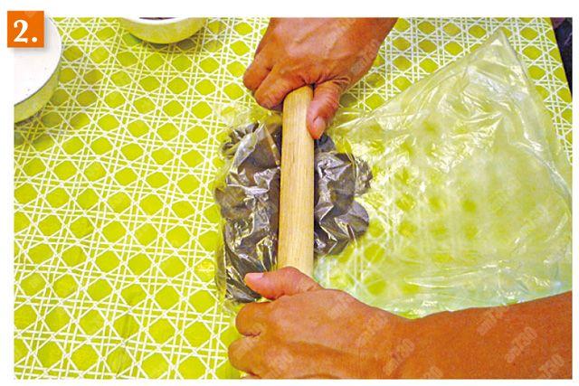 2.將朱古力餅放在膠袋內,用棍將其壓碎。再和已溶牛油拌勻後,倒入模具壓實,放在雪櫃冷藏30分鐘。