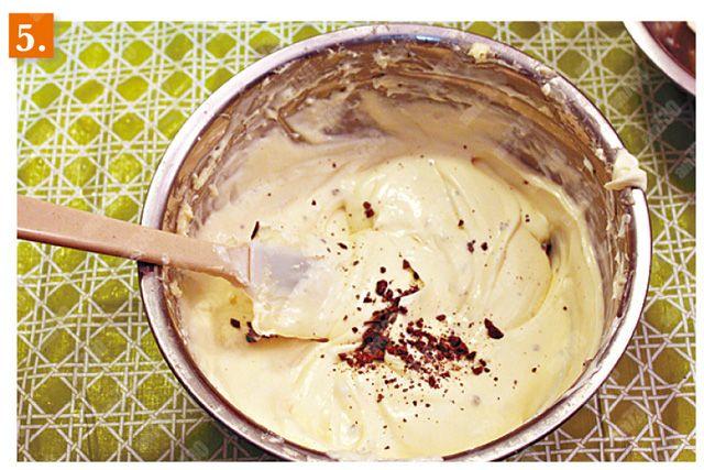 5.壓碎朱古力後,再加入朱古力碎粒攪勻。