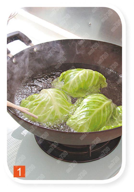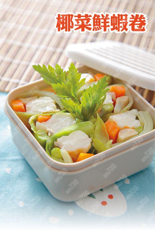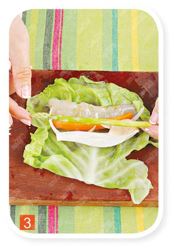 做法:3. 將蝦、秀珍菇、甘筍絲、洋葱絲及幼露筍段鋪在椰菜片上,灑上幼鹽,捲好後放在碟上隔水蒸15分鐘,即成。