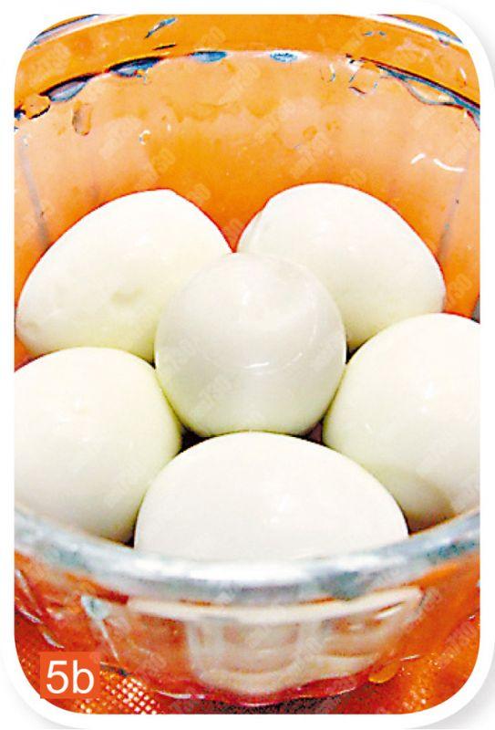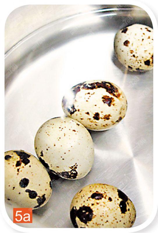 5.鵪鶉蛋洗淨,烚煮約三至四分鐘,至熟取出,沖冷水後去殼。