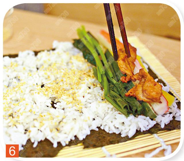 6.將一片紫菜放在日式壽司蓆上,鋪上白飯,然後在上端放上芝麻,排上炒熟的豬肉片、菠菜段、青瓜條、黃白蘿蔔條和蟹柳絲。