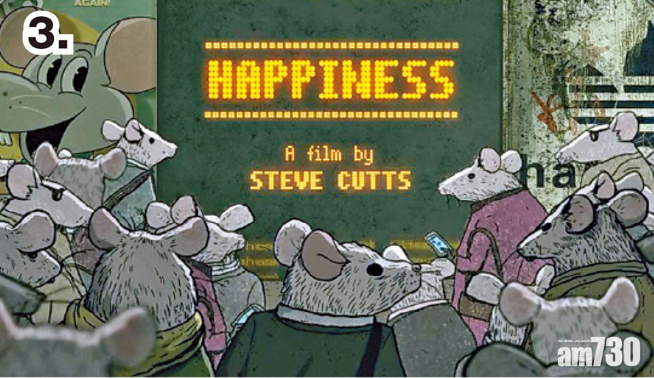 《Happiness》 (圖3)是Steve Cutts又一末世眾生相動畫代表作,尋找快樂人生的背後底蘊,究竟甚麼是快樂?所謂快樂,早淪為物質主義掌控下的一種病態謊言,每次重看多一次,愈心寒多一次,從此聽到歌神唱出「快樂,其實邊一位都有份!」這一句,快樂不再一樣,撫心自問,你快樂嗎?還是更想早登極樂?