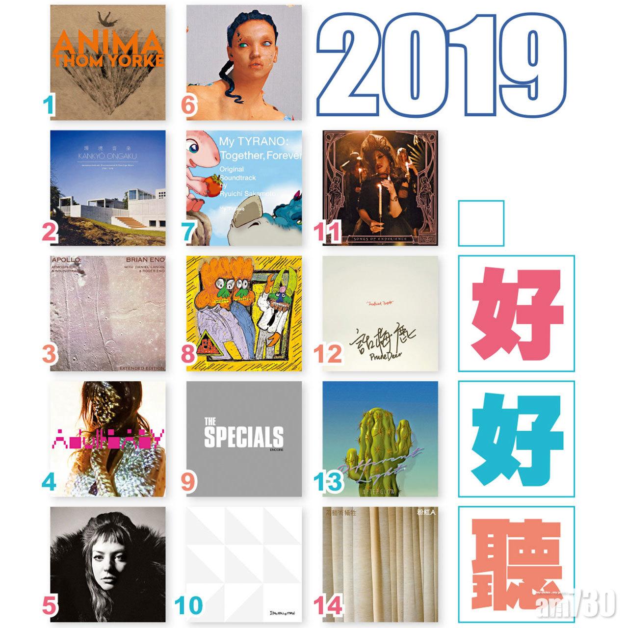 不得不提,坂本龍一為韓國動畫《My Tyrano: Together, Forever OST》(圖7)原聲配樂,出奇不意重拾很八十年代最拿手的電氣配方,首首旋律優美,是去年大家睇漏了眼的教授配樂佳作;Portishead長期處休,Geoff Barrow自家迷幻實驗組合Beak>卻非常勤力,全新4曲EP《Life Goes On》(圖8)又是2019好好聽之選,主題曲似聽到Kurt Cobain參與主唱的Kroutrock/Prog Rock新變種,其他還有The Specials《Encore》(圖9)及New Order《 ∑(No,12k,Lg,17Mif) So it goes..》(圖10)兩隊英國戀殖共鳴良音,本地獨立出品亦有Serrini《邪童謠》(圖11)、話梅鹿《Insufficient Postage》(圖12)、Afterglow《Different Light》(圖13)及粉紅A《為藝術犧牲》(圖14)。