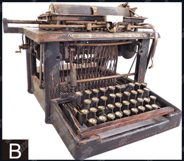 [B] 1879年生產的Remington Standard Typewriter No. 2,拆除機身旁板後,內裏結構清晰可見。