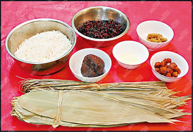 材料:(10隻分量) ‧糯米─600克 ‧紫米─300克 ‧豆沙─300克 ‧黃糖─80克 ‧桂圓乾─100克 ‧生油─20克 ‧粽葉─20塊 ‧鹹水草─20條