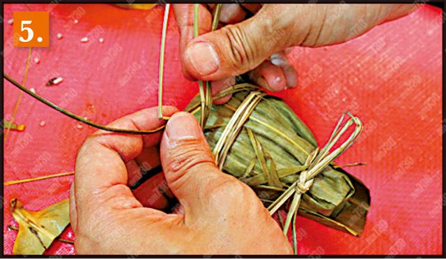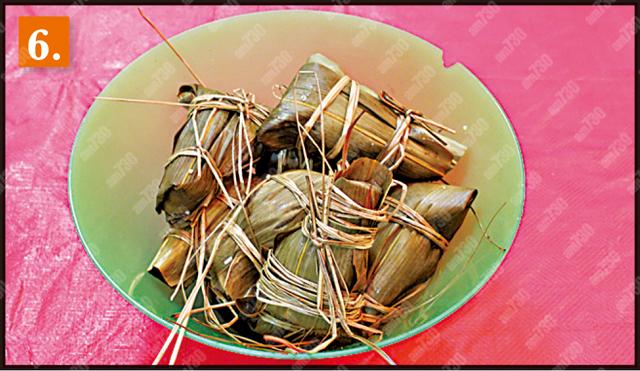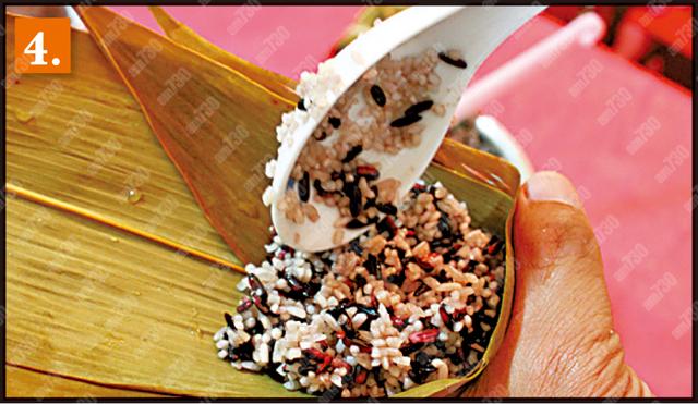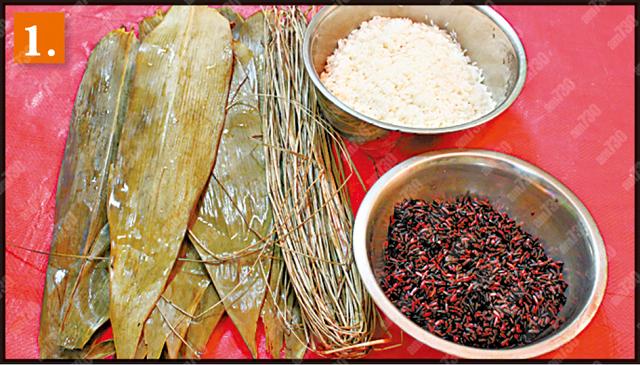 做法: 1.紫米和糯米洗淨後浸幾小時,粽葉和桂圓乾洗淨後略浸。 2.紫米和糯米瀝乾水後,加入黃糖、桂圓乾和生油混合。 3.先將粽葉頭剪去,再在粽葉尾屈成小袋。 4.放入兩匙米後,加入豆沙在中間,再加入兩匙米。 5.將粽葉蓋好接合後,用鹹水草將粽子扎好。 6.把粽子隔水蒸約90分鐘後即成。 貼士:紫米較硬,一定要先浸幾小時以上。