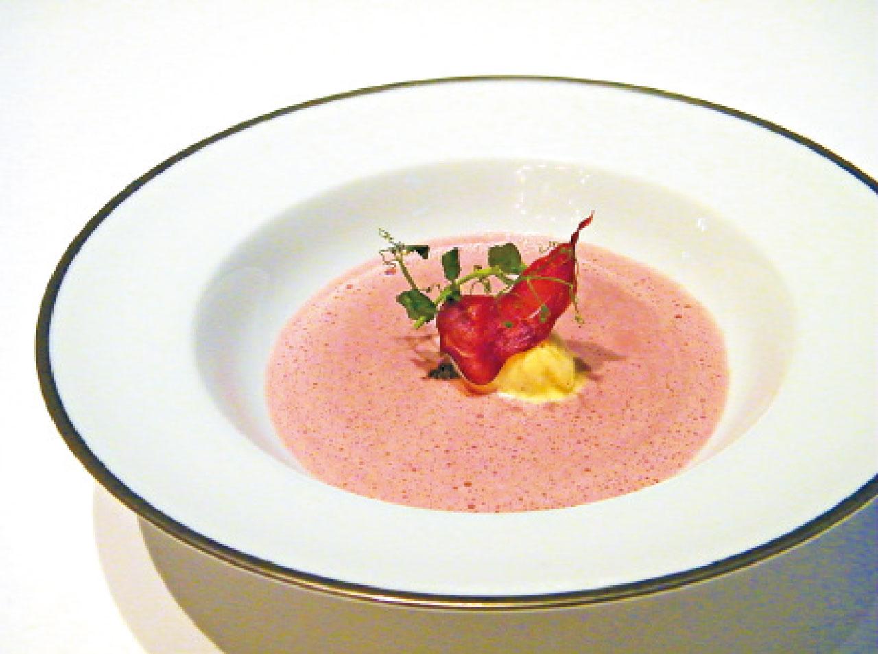 2. 紅椰菜忌廉湯配蘋果肉桂雪糕及風乾鹿肉脆片,碟底先放雪糕並插上鹿肉脆片,注入熱紅椰菜忌廉湯,湯滑菜甜,雪糕半溶,鹿肉脆片燈影鹹香。($185)