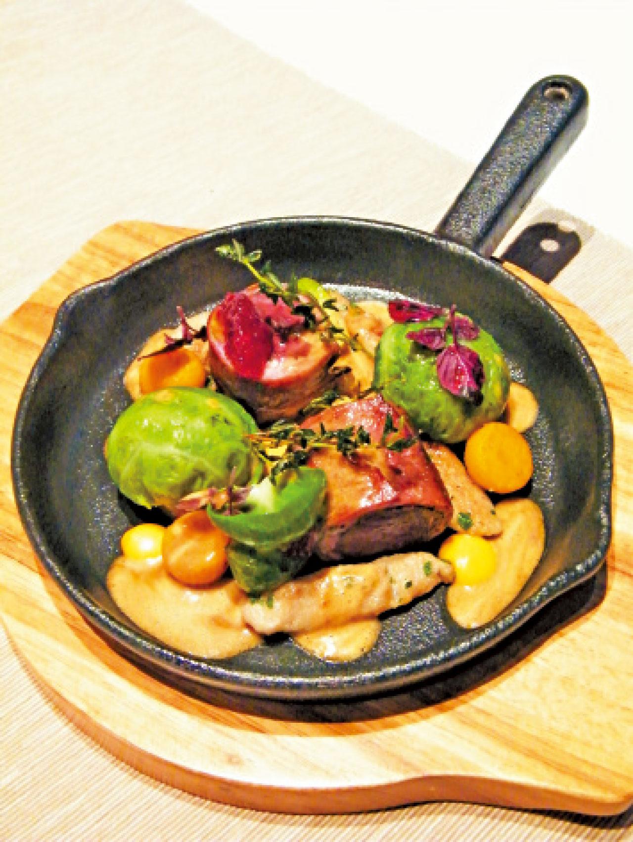3. 煙肉裹狍鹿柳釀皺葉椰菜配捲心菜、南瓜、瑞士式栗子麵條及柑橘野味汁,汁帶酸甜,煙肉油脂滲在鹿肉內,甘香半嫩。($425)