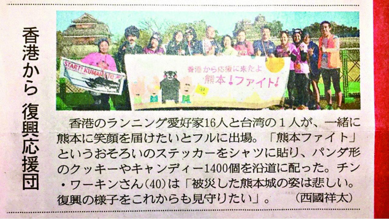 上回講到,我們與一眾香港跑友,準備在熊本城馬拉松派奇華熊貓曲奇餅給沿途應援的小朋友,為地震災後的熊本,送上來自香港的祝福。我們終於在上周日完成任務了,當地報章《熊本日日新聞》更在比賽當日採訪我們,讓我們將派曲奇的行動,成功推上日本傳媒呢!