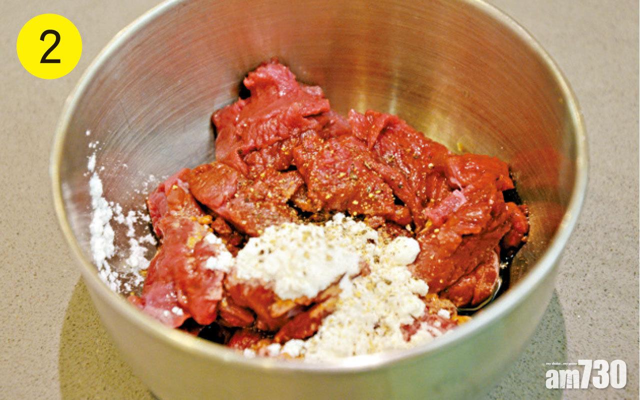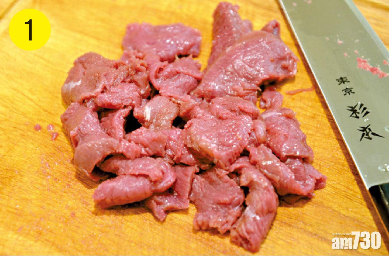 1-2. 將鴕鳥肉洗淨,瀝乾,切片,用鴕鳥肉醃料醃好。