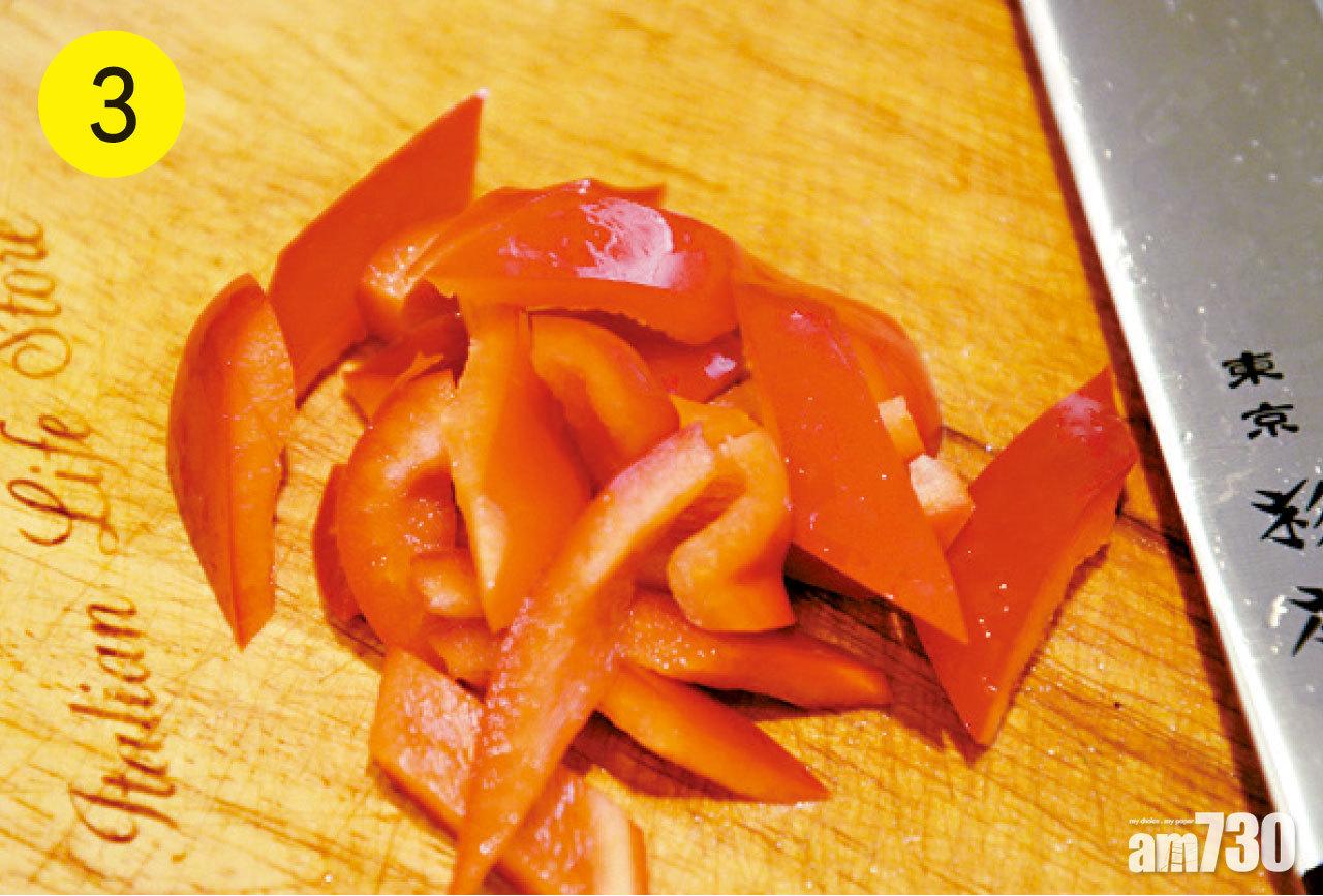 3. 紅甜椒去蒂,去籽,洗淨,切細件。
