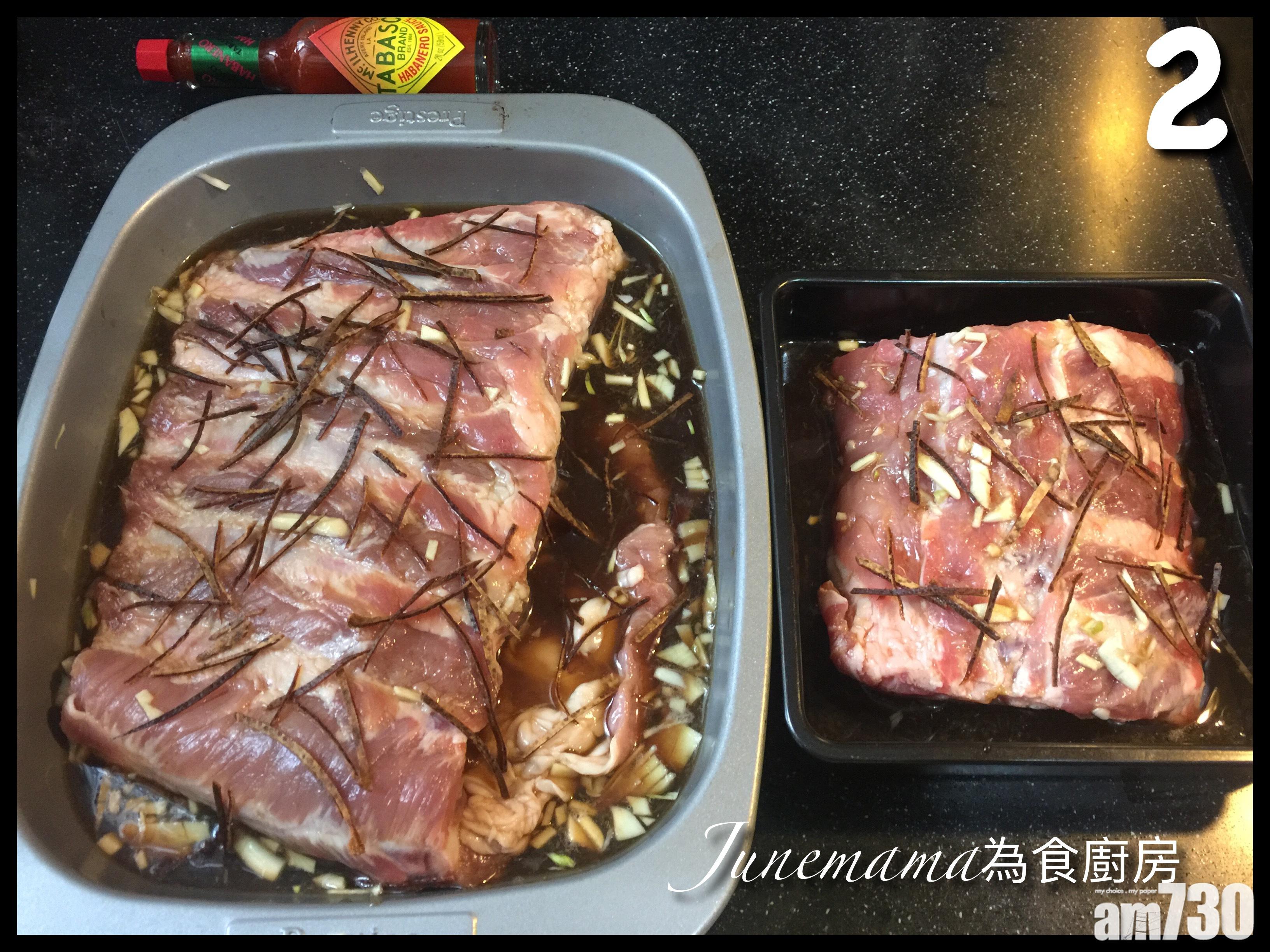 預熱焗爐180度;將金沙骨放在烤盤上,並用錫箔紙覆蓋,放入焗爐30分鐘,然後將溫度降低到160度1小時30分鐘;之後取走錫箔紙,掃上楓糖/蜜糖,再焗多10分鐘即可。