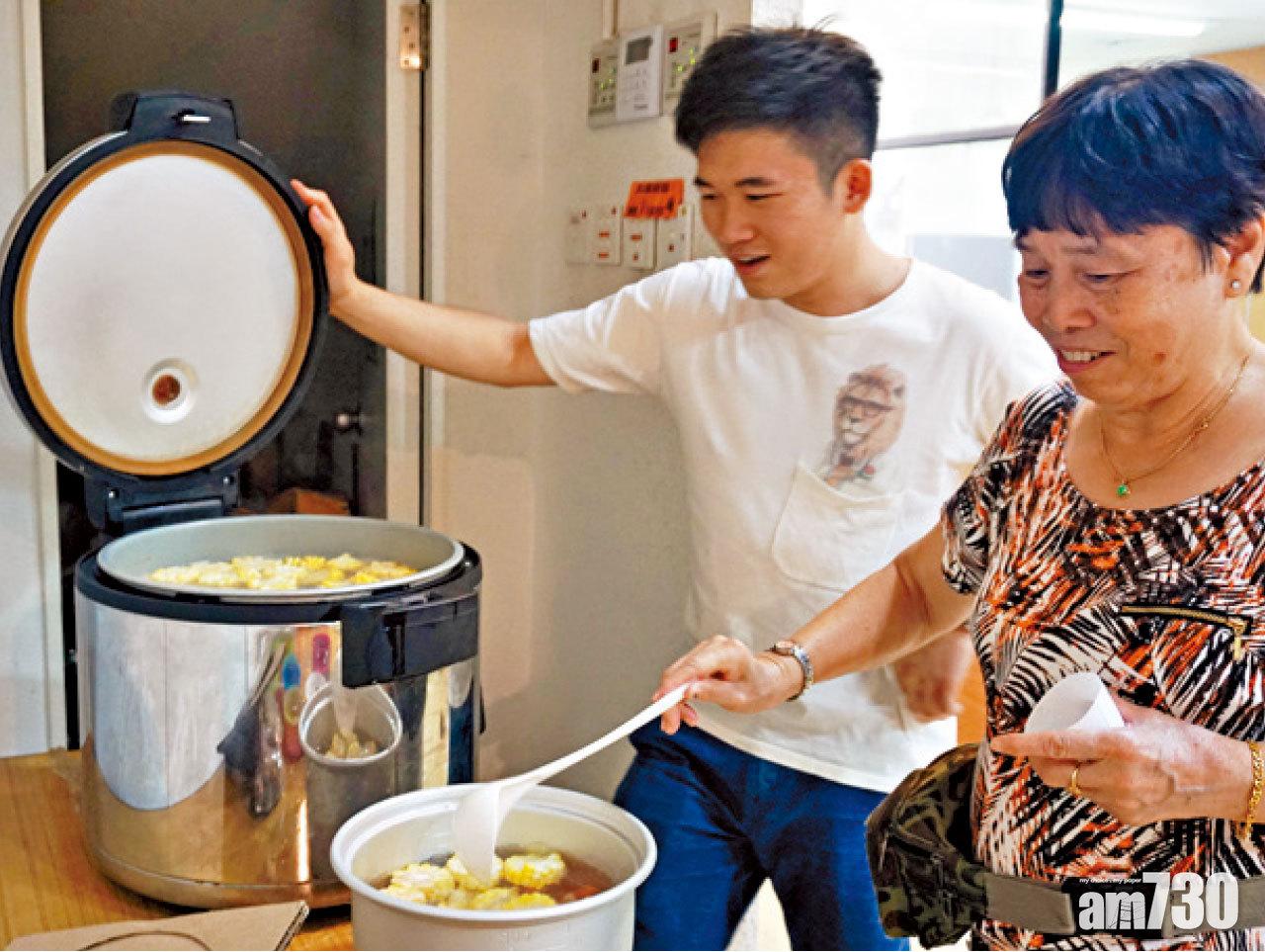 秋英(右)與青年義工一起煲湯與街坊共享。