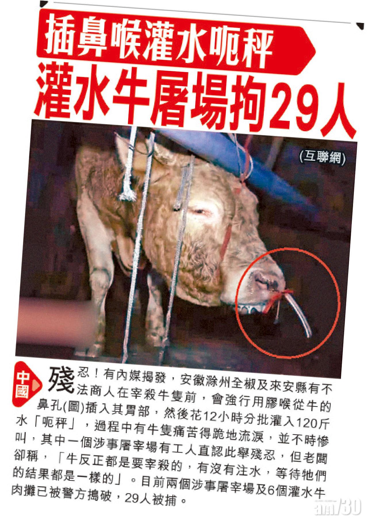 上周有傳媒揭發有屠場工人向準備屠宰的牛的身體內灌水,從而增加牛隻重量以牟利。水管從牛的鼻孔直插牛的身體內,是令人髮指的虐畜行為。可悲的是,世上總是有這種無所不用其極的無良商人,為了牟利而欺騙消費者。
