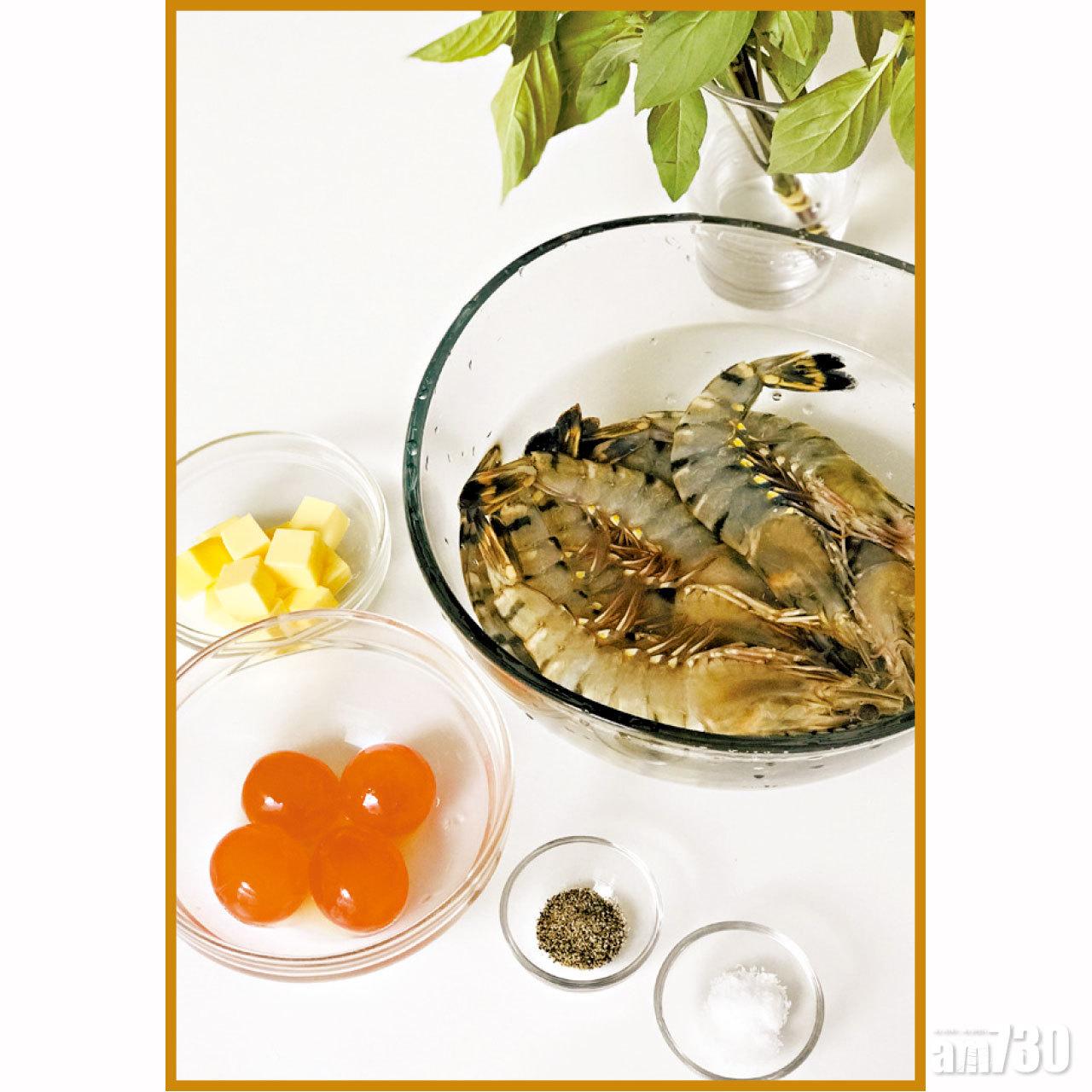 1. 用廚紙印乾虎蝦,加少少鹽、胡椒醃一醃。