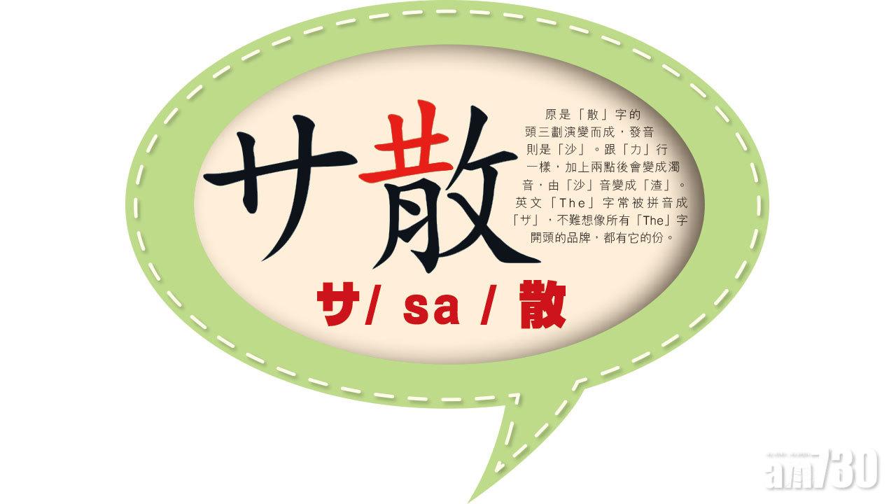 原是「散」字的頭三劃演變而成,發音則是「沙」。跟「カ」行一樣,加上兩點後會變成濁音,由「沙」音變成「渣」。英文「The」字常被拼音成「ザ」,不難想象所有「The」字開頭的品牌,都有它的份。