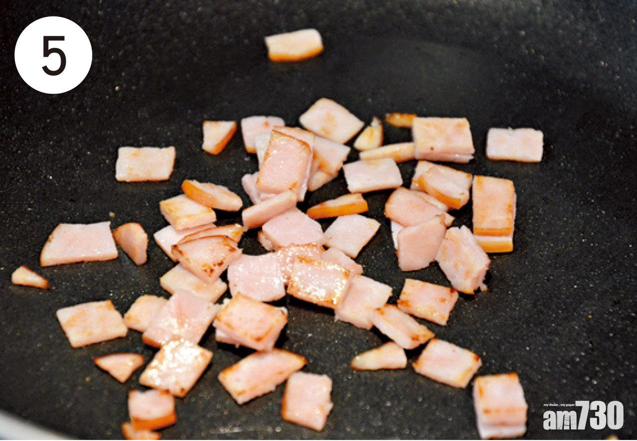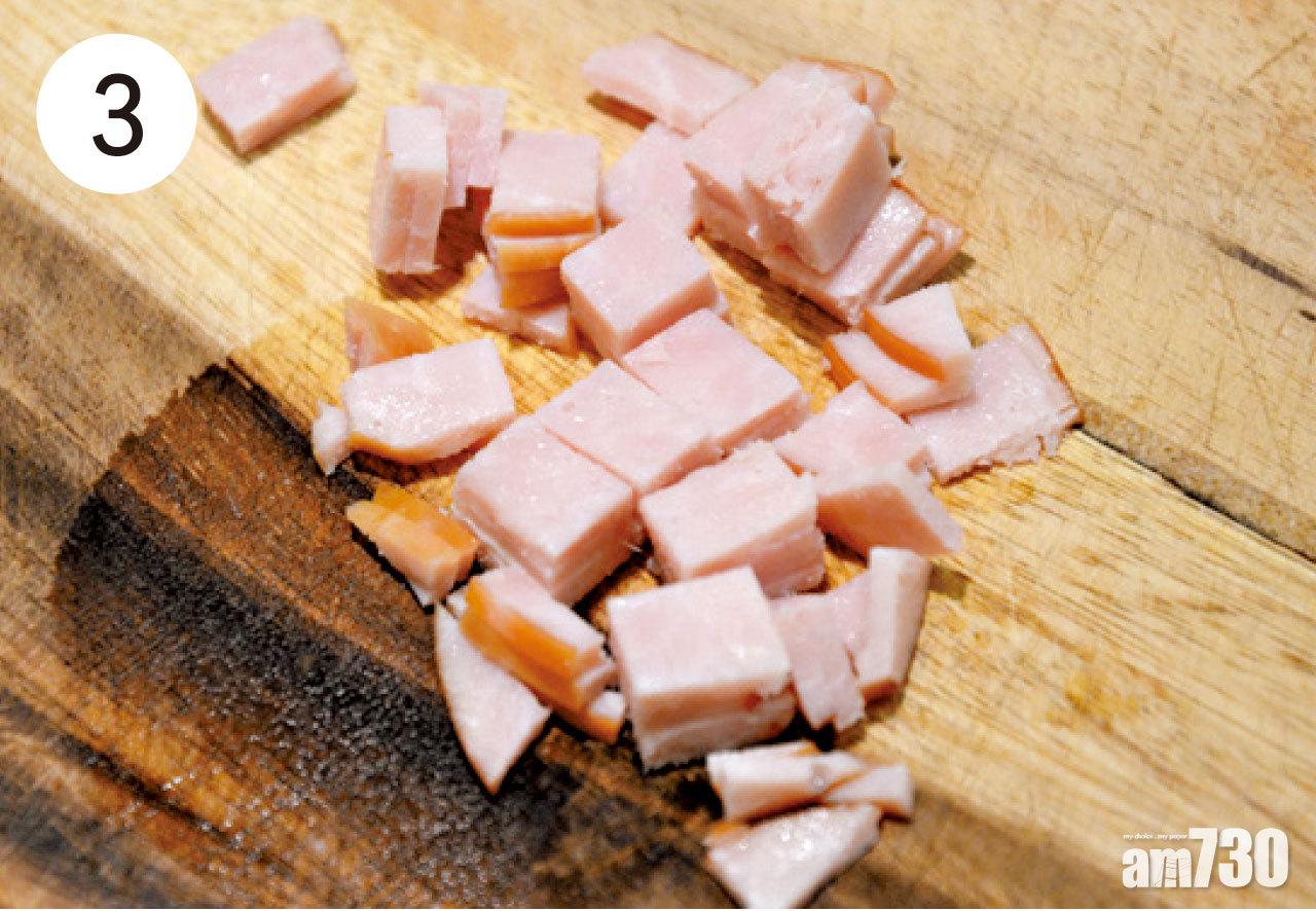 3.煙火腿切粒。車厘茄洗淨,瀝乾,切半。