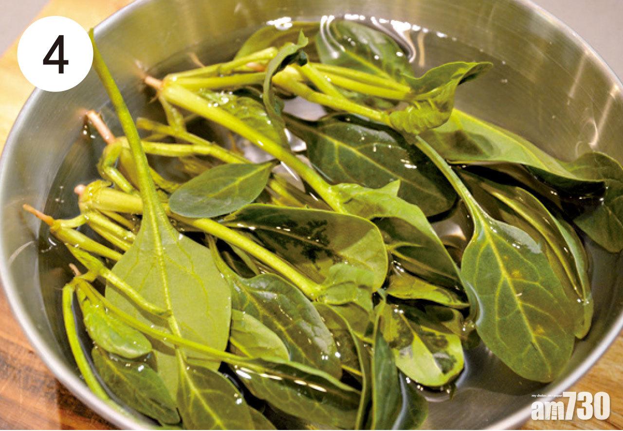 5. 燒熱鑊,下油,炒香煙肉粒和BB菠菜,放少許岩鹽炒勻,盛起。