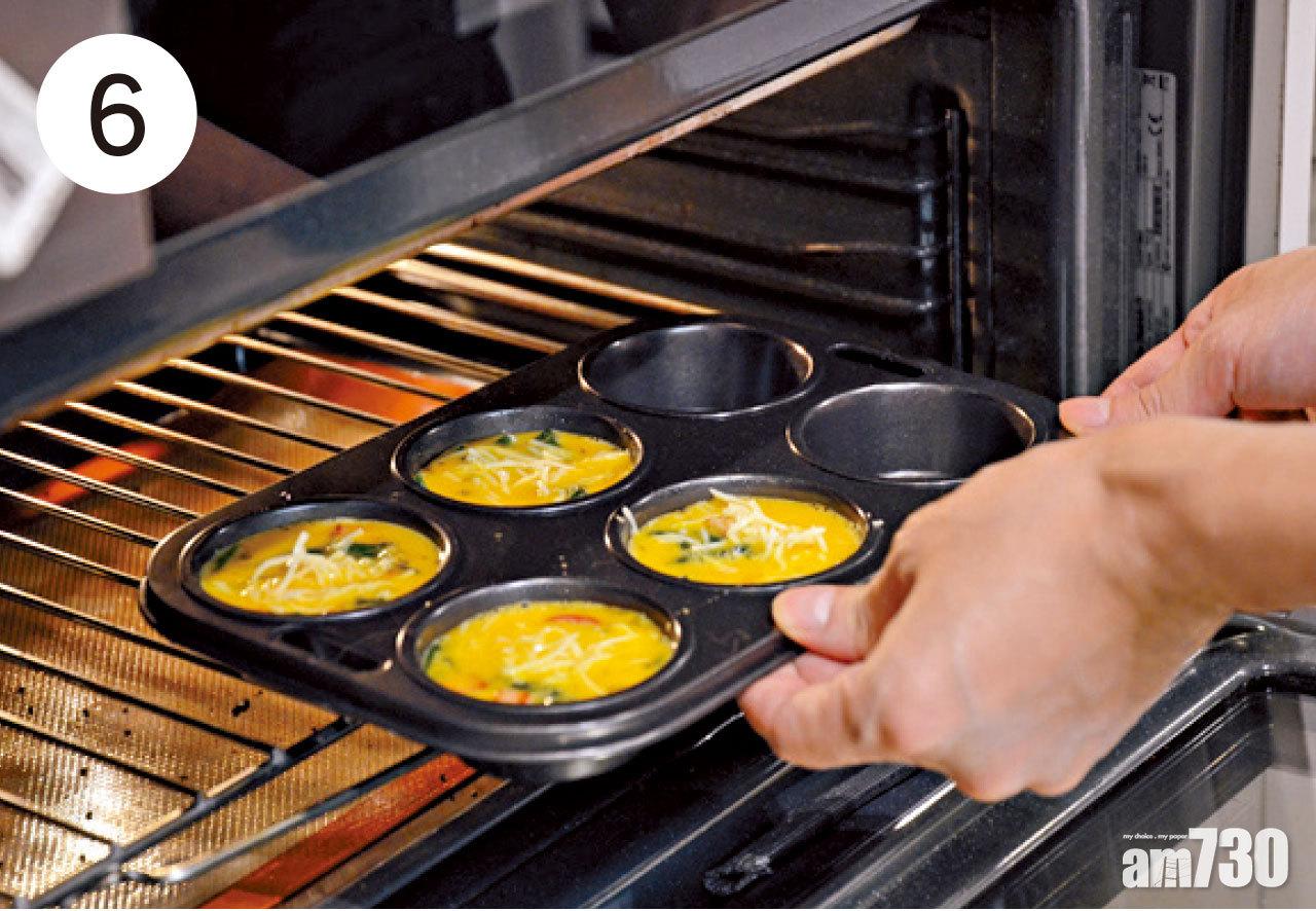 6. 於Muffin模具內均勻塗抹少許油,先將半份蛋液倒入模具內至一半容量,放入已炒的菠菜煙肉粒,加入車厘茄、黑椒和香草碎。將餘下的蛋液倒入模具至滿,灑上芝士碎放焗爐焗10分鐘,取出。