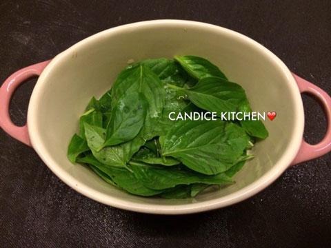 圖1:把九層塔洗淨瀝乾水後,只摘下九層塔葉待用。九層塔在街市售賣泰國、越南或印尼香料的店子有售。(相片由作者提供)