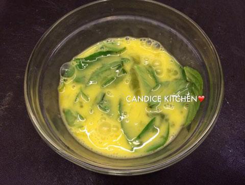 圖2:打勻2隻雞蛋,把九層塔葉放進雞蛋內拌勻。(相片由作者提供)