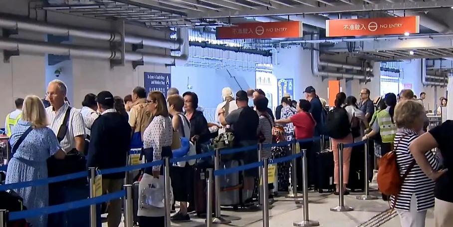 啟德郵輪碼頭大批旅客在的士站排隊。(資料圖片)
