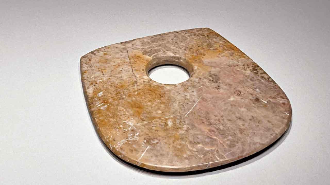 鉞由斧轉化而來,從生產工具變為一種兵器。以玉製成的鉞,則不具備作戰功能;此石鉞的特徵與淩家灘出土的玉鉞相似,三邊磨薄呈刃狀,刃口沒有發現使用痕跡,相信只是作為墓主人軍事權力和身份象徵。展覽中石峁遺址及焦家遺址有其他鉞例子,展示了時代間文化交流及中華文明由多元走向一體。