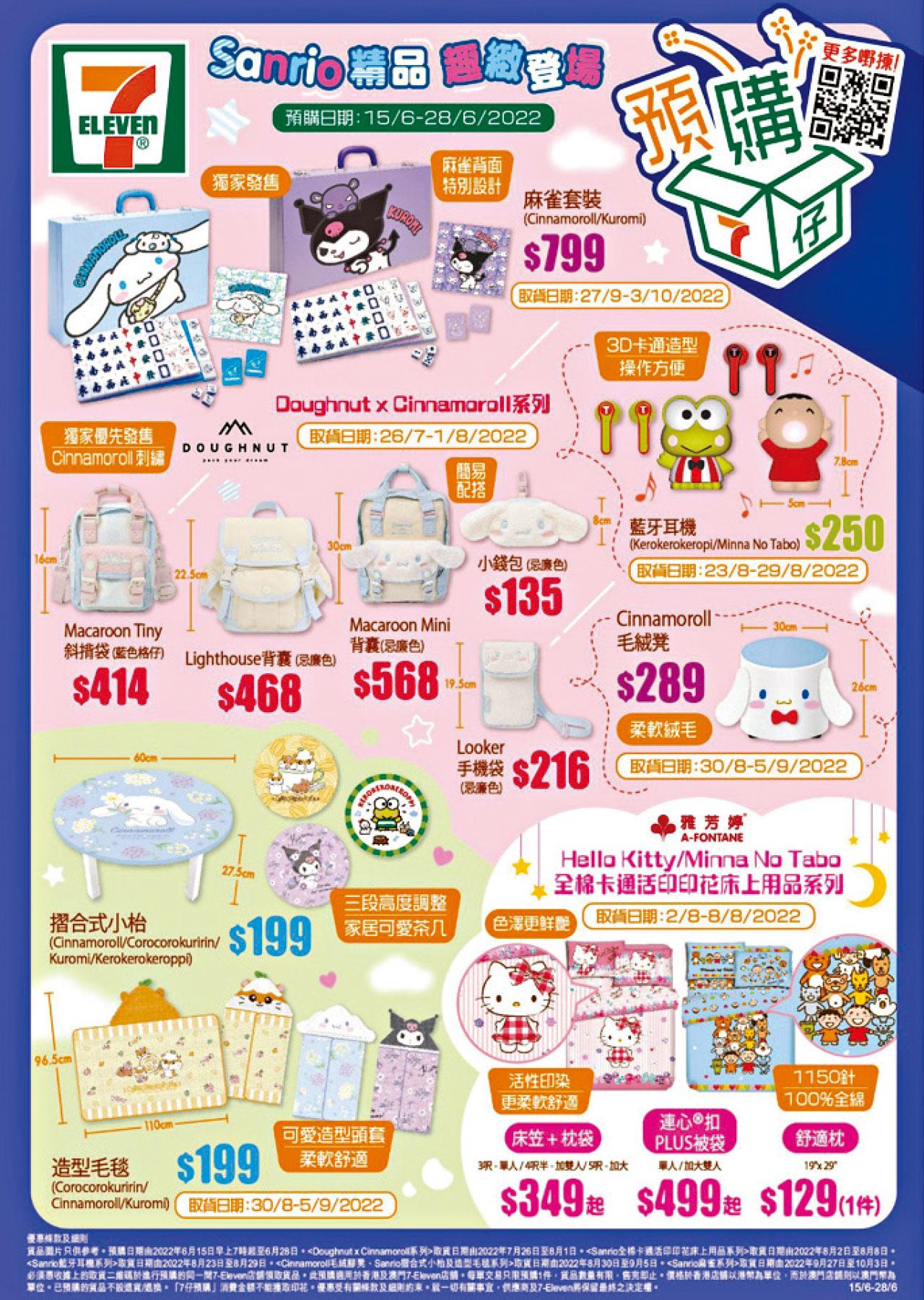 另外,今期7仔預購亦推出Sanrio床品及家品系列,包括大口仔及Hello Kitty床具,粉絲們千萬不要錯過。另外有一系列Sanrio家品,包括Cinnamoroll及Kuromi麻雀、摺合式小枱、藍牙耳機、納米蒸氣熨斗等……應有盡有。生活沉悶想多些色彩,就唔好錯過啦。一於6月15日早上7時起到7仔預購,將它們帶回家吧!