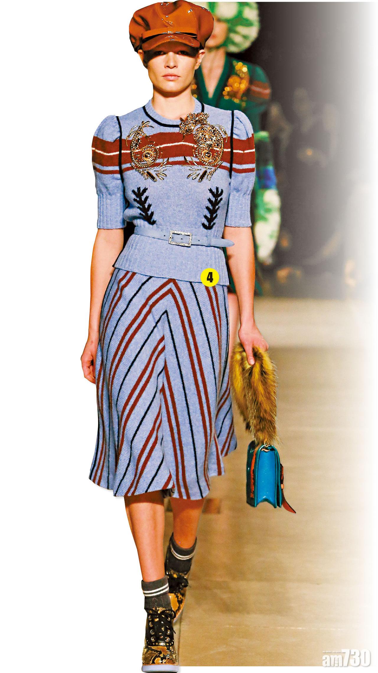 此外,今季的針織上衣及毛衣(圖4及5)分別用了藍鈴色及深綠色,加上條紋及金色刺繡後,更散發高貴優雅氣質。